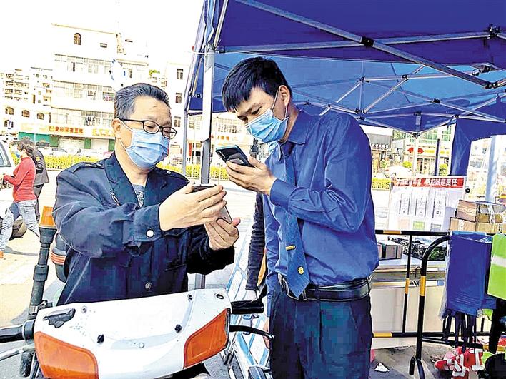黄亨(右)向居民推广“疫查通”。