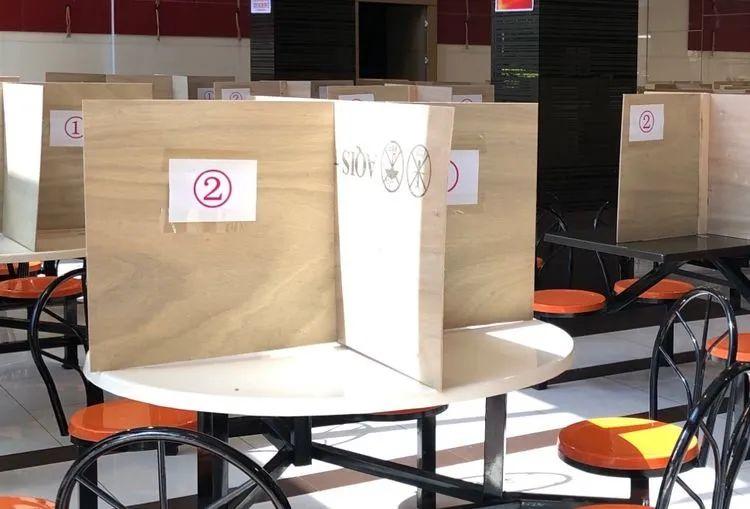 值得一提的是新李英公司的“创新餐桌”。他们将每张餐桌用两块木板在中间纵向隔开成四个区域,员工用餐分四批次进行,每批次员工依次按照“1、3、2、4”编号对号入座。员工一人一桌,吃完离席时还要放下公司发的“标识牌”,示意本卡位已用过。