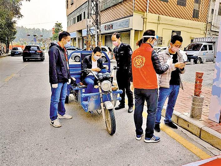 戴树雄(左一)在卡点值守检查。