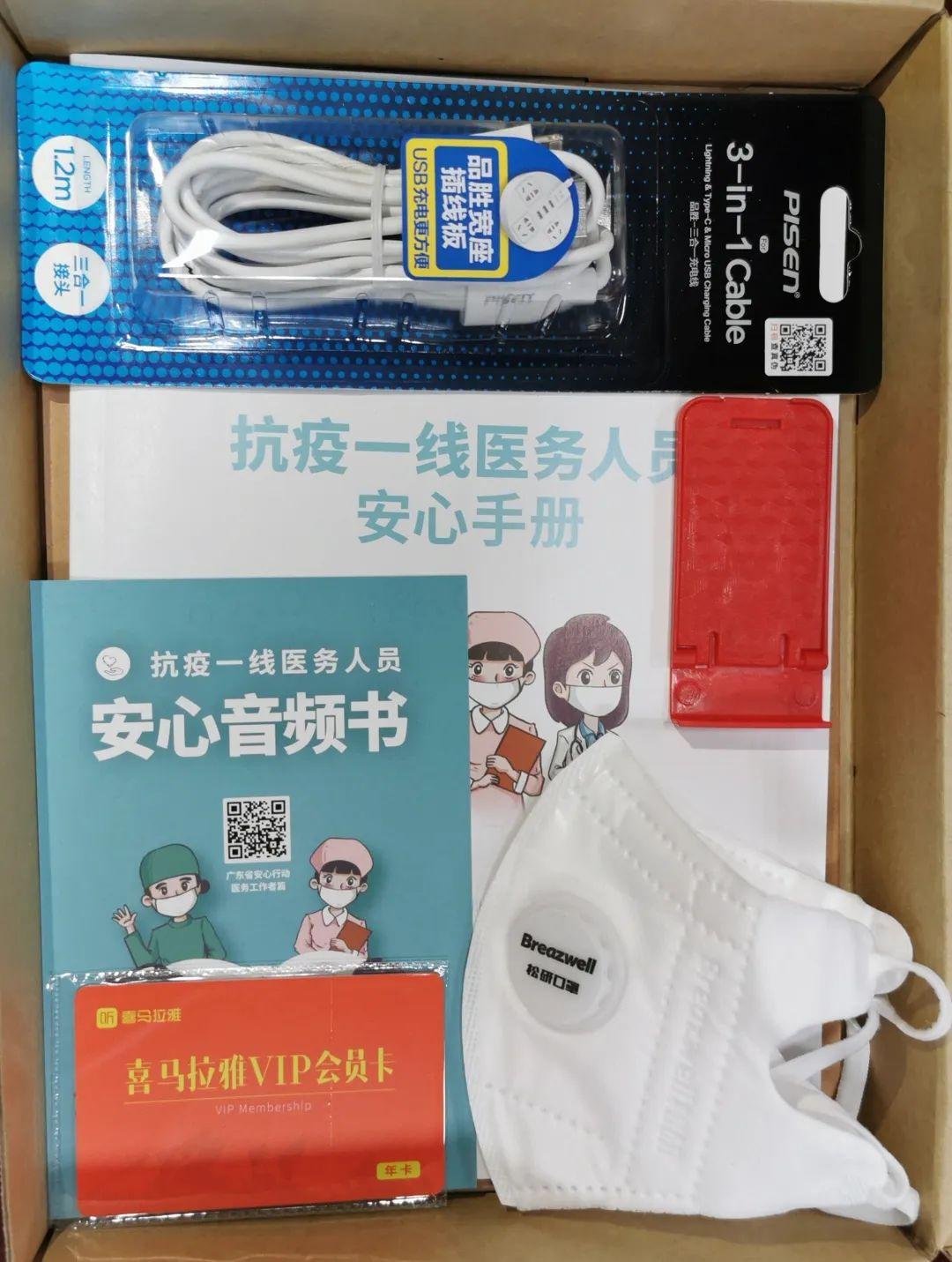 “安心行动”精心设计制作“安心宝盒”,每个宝盒配有医务人员安心音频书、安心问候卡、安心手册、喜马拉雅有声书卡以及2个N95口罩等物品。
