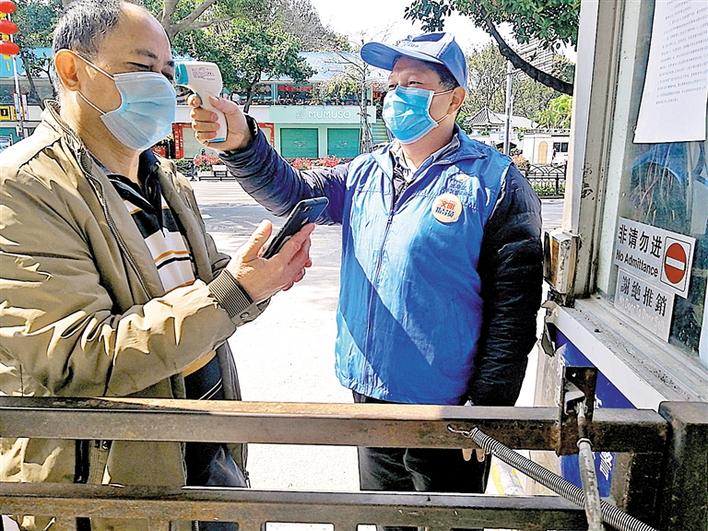 区文促会文明指导员康西方(右)在龙华龙园社区参与疫情防控服务。