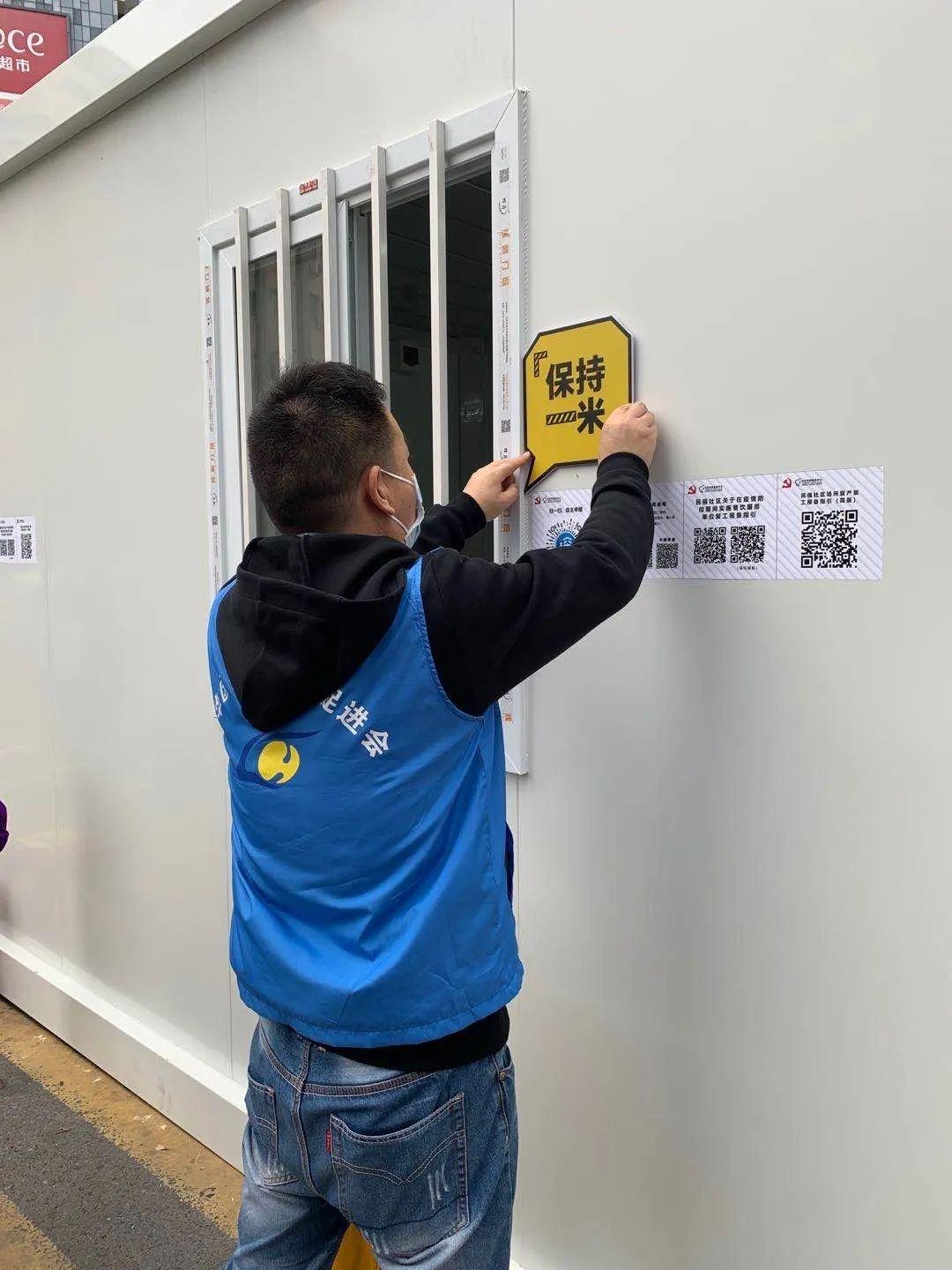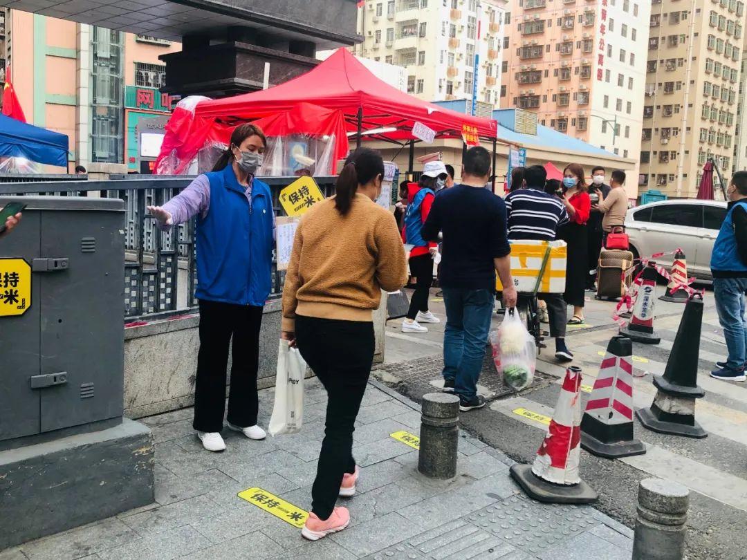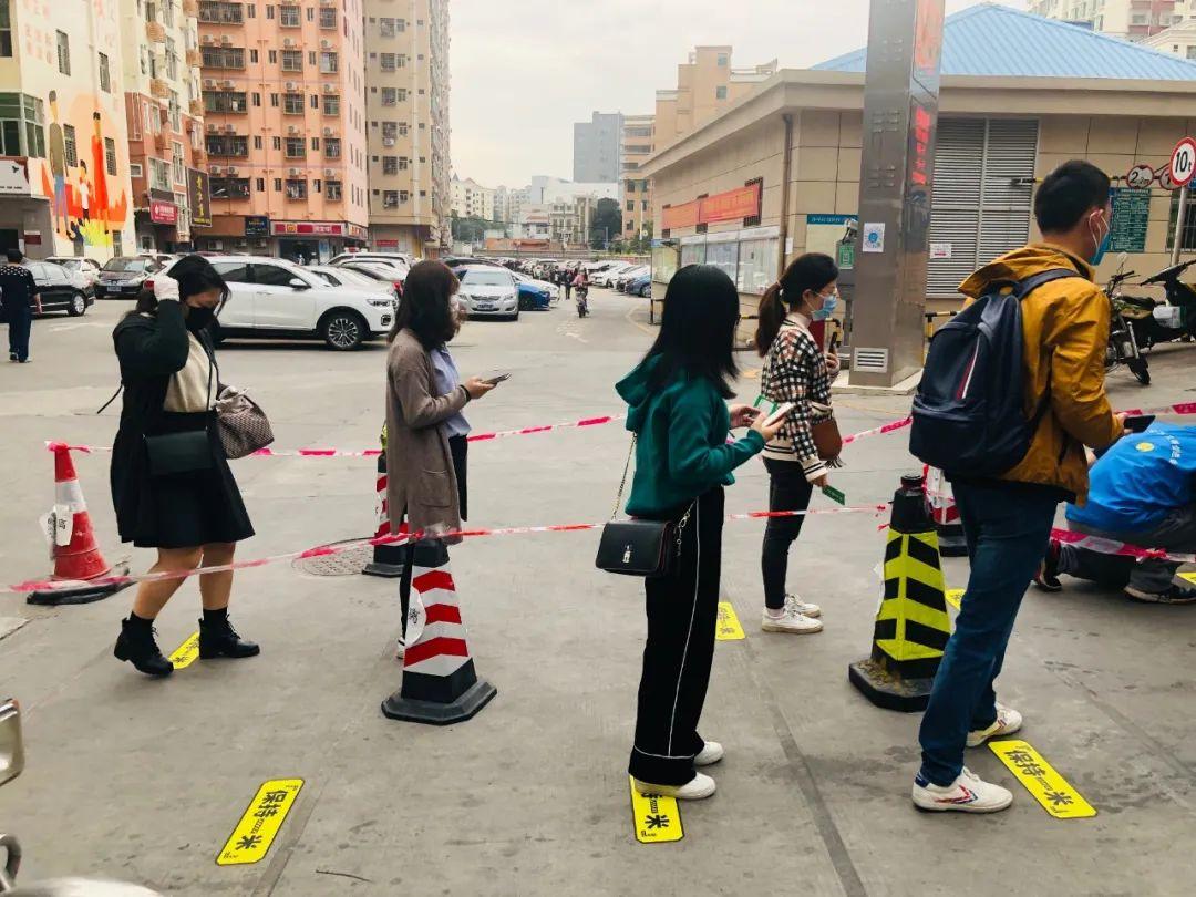 上班早高峰时段,文明实践战“疫”先锋队手拿“保持一米”标识牌来到社区(城中村)出入口,引导大家有序排队,地上黄色的地标线非常醒目,市民有序排好队接受各项防疫检测。