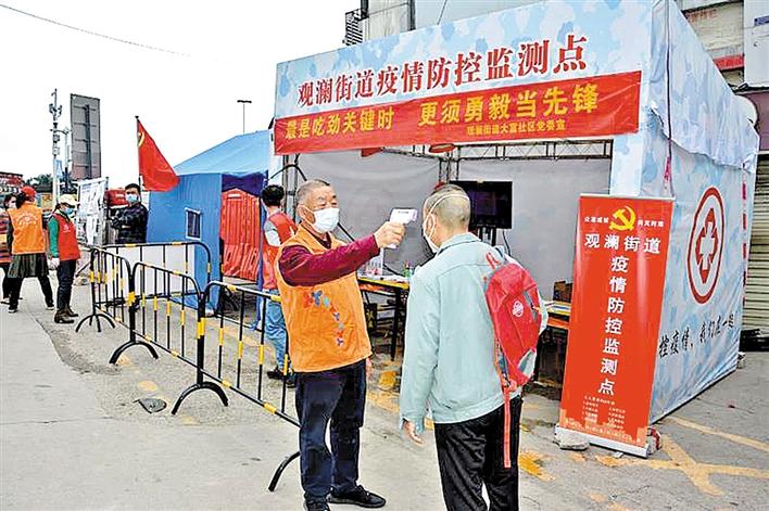 周厚书(左)在为居民测量体温。