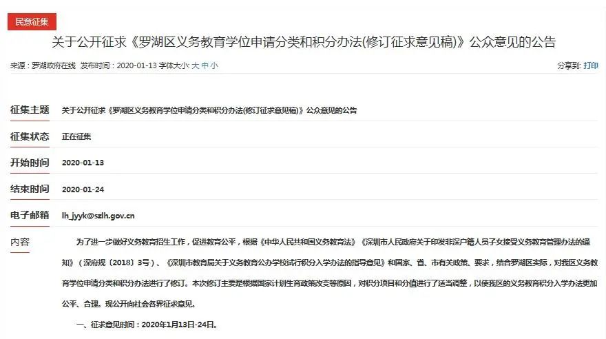 罗湖区在1月13日发布了《罗湖区义务教育学位申请分类和积分办法(修订征求意见稿)》向市民征求意见。