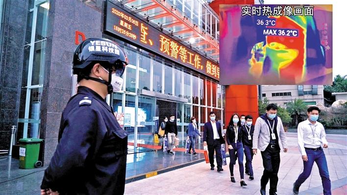 据悉,银星科技园使用的热成像头盔N901,由园区智能制造企业——深圳光启高端装备技术研发有限公司打造。该头盔无需施工布线,佩戴即用,部署灵活。只要一眼扫过,佩戴者即可完成对前方数米范围内目标人员的扫描。在无接触和保持安全距离的情况下,监测人员可在2分钟内完成对上百人队伍的体温筛查和记录,且对发热人员的检出率达100%。值得一提的是,该头盔还具有热成像夜视查看功能,不受光线限制,不但能准确筛查人体、动物体温,夜晚巡逻还能看到闷火。