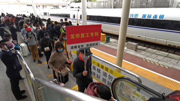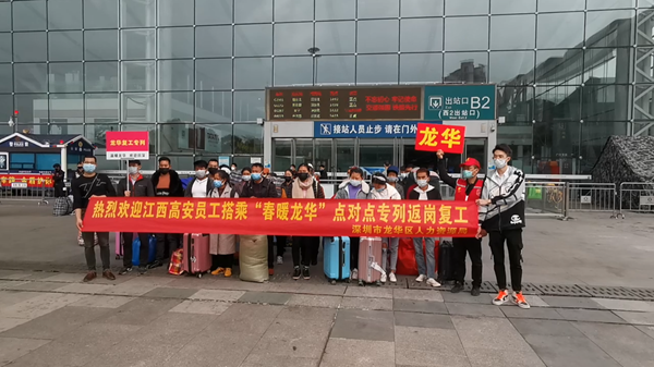 据了解,受新冠肺炎疫情影响,各地务工人员返深路途不畅,企业复工复产用工紧缺问题突出。为帮助企业解决用工问题,龙华区出台了《深圳市龙华区关于支持重点企业员工加快返岗及吸纳新员工的若干措施》,并多方向组织包车接返辖区员工。3月12日,龙华区开启江西、湖南、广西方向的“点对点”专列专车,“一车一目的地”“一车一方案”为辖区企业免费接返一批老员工及招募新员工。同时,龙华区人力资源局还为返岗员工送上了疫情防护温暖包,包括口罩、酒精喷雾和《就业服务手册》。当天,始发于湖南岳阳东站的专列(厢)也于下午5点抵达深圳北站。