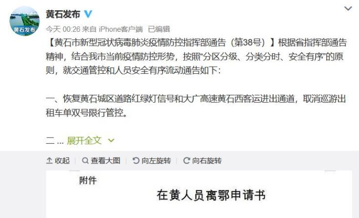 一、恢复黄石城区道路红绿灯信号和大广高速黄石西客运进出通道,取消巡游出租车单双号限行管控。