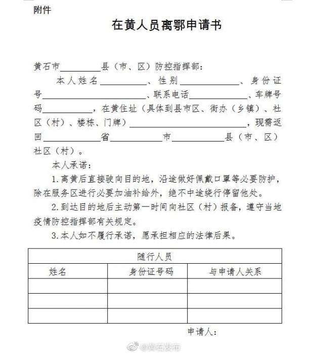 六、严格管控在黄人员及车辆离鄂通道。在黄滞留人员及车辆离鄂(北京市除外),凭司乘人员健康“绿码”、接收地单位或社区(村)接收证明(注明全部司乘人员相关信息)向现居住地所在县(市、区)指挥部提出离鄂申请(附件:在黄人员离鄂申请书),现居住地所在县(市、区)指挥部为离鄂人员出具健康证明,采取“点对点、一站式”办法,经测温查验登记后离黄。