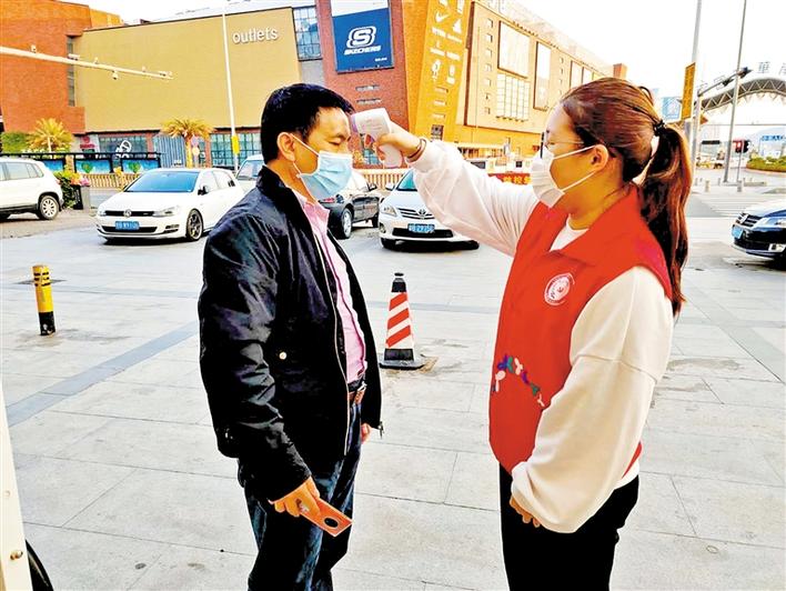 豆豆(右)在社区防疫卡点为居民测体温。