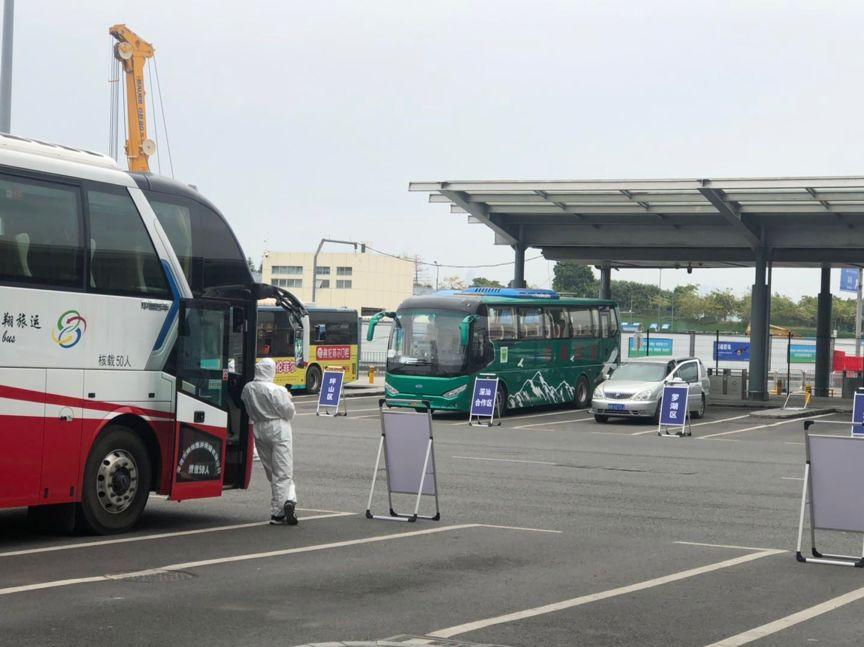 各区配备的大巴车,分流处配备翻译人员、外事专干