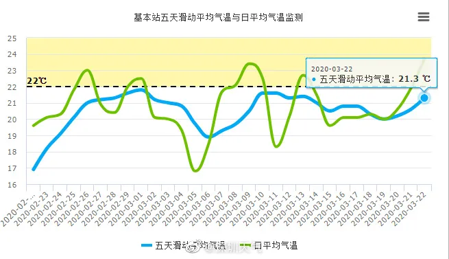以5天滑动平均气温稳定>22 ℃ 为春季结束、夏季开始,看图一中的蓝色曲线(五天滑动平均气温)已经在抬头了,能不突破虚线还得看接下来几天的气温。
