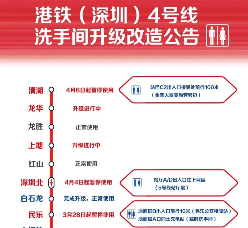 3月28日起深圳地铁4号线地下站车站民乐站、深圳北站、清湖站洗手间将陆续暂停使用,进行全面升级改造计划今年6月份完工改造完成的洗手间有哪些变化呢。∇“据悉,洗手间顶部多处安装直排风机,彻底改善卫生间异味,更换全新的卫生设备,集残障人士、母婴都可用的卫生间还增加母婴护理设施,女卫生间更人性化地增加厕位数量。另外,上塘站、龙华站洗手间的整改升级即将完成