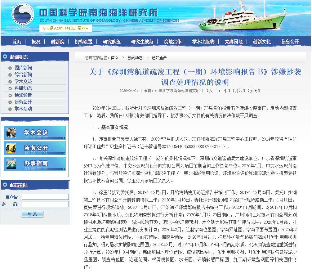 4月1日,中国科学院南海海洋研究所在官方网站发布关于《深圳湾航道疏浚工程(一期)环境影响报告书》(以下简称《环评报告》)涉嫌抄袭调查处理情况的说明。