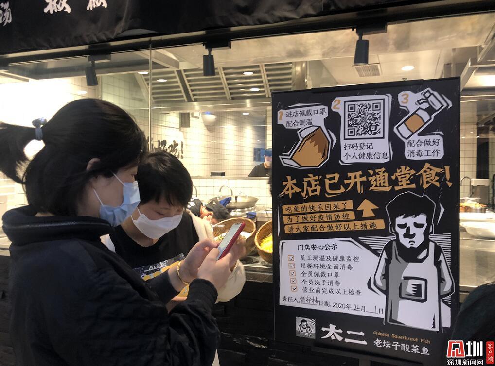 在太二酸菜鱼门口,多位市民正按照员工要求,排队扫码登记个人健康信息。太二酸菜鱼工作人员表示,门店严格按照要求,做好员工和消费者体温检测、健康监控和佩戴口罩洗手消毒等防疫防控工作。