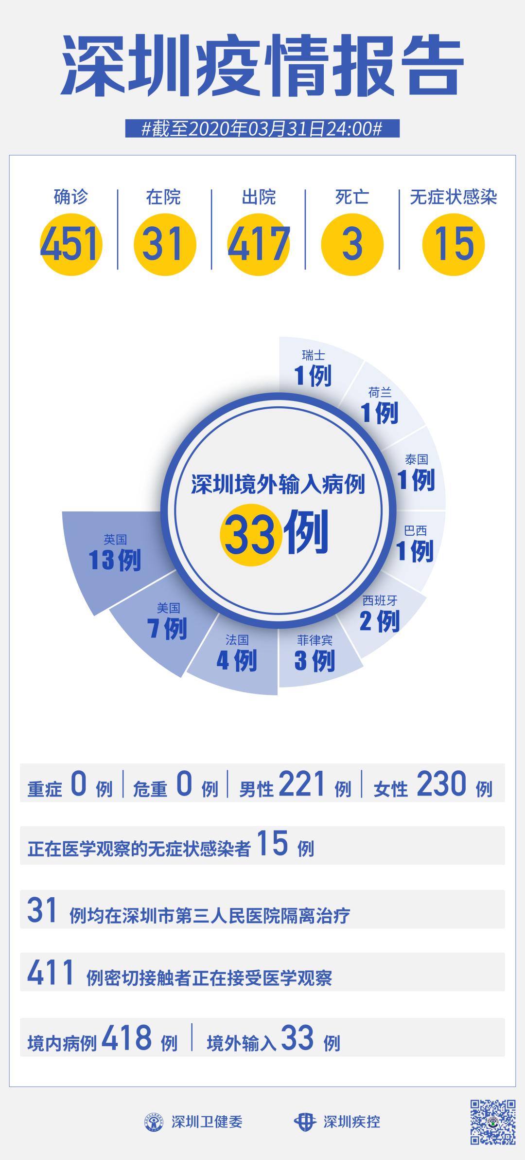 目前,死亡3例,累计出院417例。31例确诊病例均在深圳市第三人民医院隔离治疗。