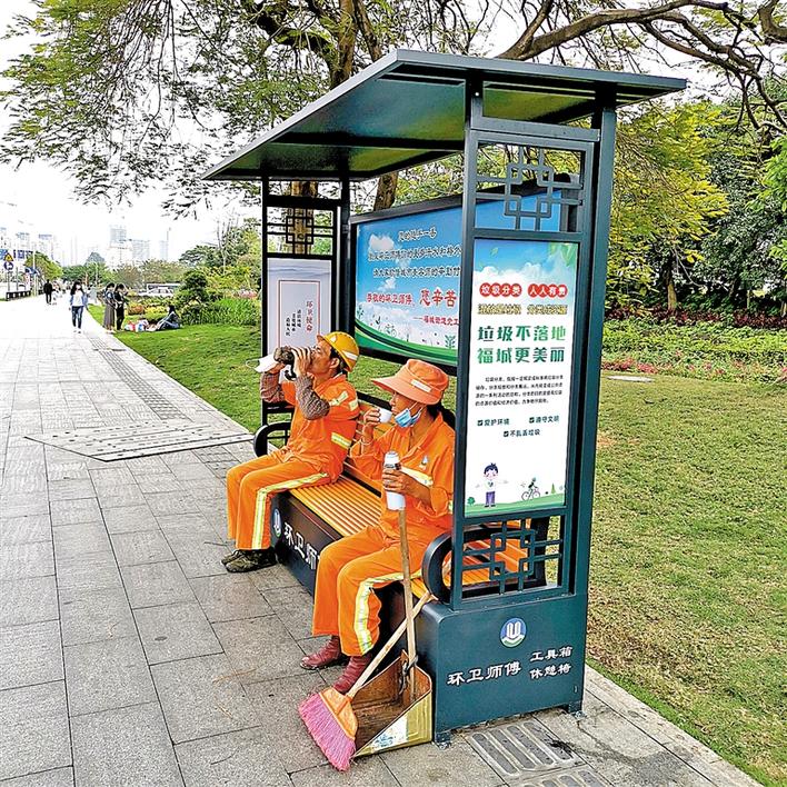 福城街道专门为环卫工人设计“环卫工人工具箱、休憩椅”,可供环卫工人休憩和存放环卫工具。