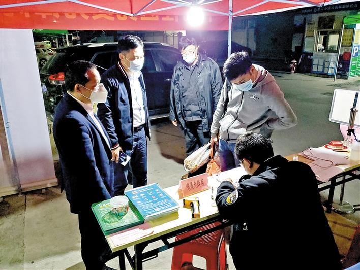 观澜街道纪工委工作人员到各城中村、商业街区、工业园等处检查防疫措施落实情况。