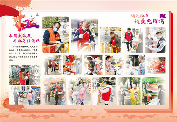为铭记战“疫”瞬间,目前福民社区设计制作了两套战“疫”墙,一套设立在福民社区工作站廉心公园,另一套在7个自然村进行巡展。每当有居民们经过,当他们驻足细细观看这面温暖的让人热泪盈眶的战“疫”墙,也许会在不经意之间发现那一张张熟悉的面孔,或许他是守在你家门那个路口测体温的人,或许他是那个“爱管闲事”的楼栋长,抑或是那个带你找房子替你倒垃圾的网格员。
