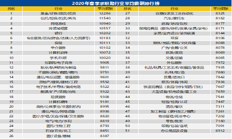 深圳特区报2020年4月12日讯 近日,智联招聘发布《2020年春季中国雇主需求与白领人才供给报告》(下称《报告》)显示,2020年春季全国白领46.3人竞争一个岗位;房地产超越互联网/电子商务成为招聘第一大户;全国平均招聘月薪8821元;网络游戏行业薪酬回落,基金/证券/期货/投资行业薪酬重回第一。