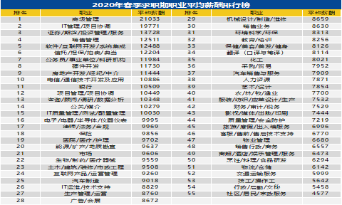 从总体职位薪酬水平来看,高级管理平均月薪仍以21033元的平均月薪继续霸占职业平均月薪第一名,其次仍是IT管理/项目协调,平均月薪为19771元,环比增长6.1%;证券/期货/投资管理/服务的平均月薪为13728元,环比增长3.0%,仍然排名第三。