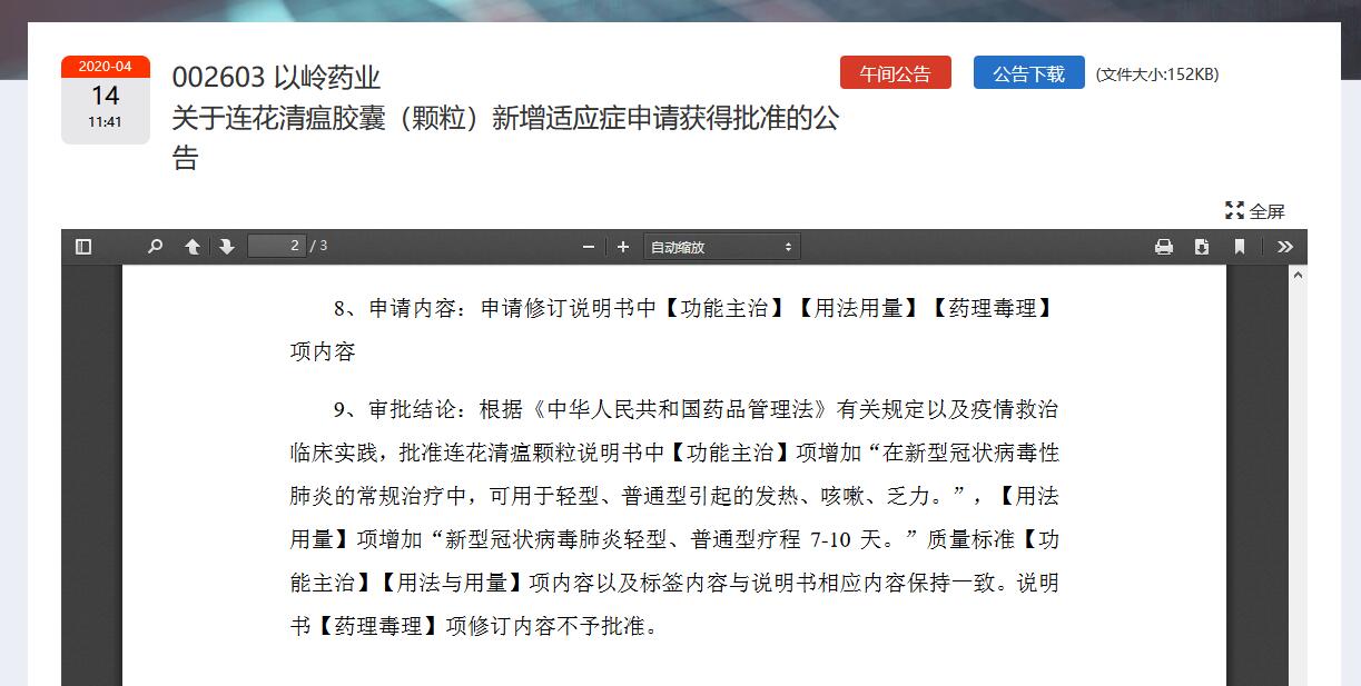 以岭药业(002603)4月14日在深交所发布《关于连花清瘟胶囊(颗粒)新增适应症申请获得批准的公告》称,根据《中华人民共和国药品管理法》有关规定以及疫情救治临床实践,批准连花清瘟颗粒说明书中【功能主治】项增加“在新型冠状病毒性肺炎的常规治疗中,可用于轻型、普通型引起的发热、咳嗽、乏力。”;【用法用量】项增加“新型冠状病毒肺炎轻型、普通型疗程7-10天。”