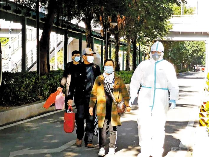 裴曦医师(右一)在转运密切接触者到医学观察点。