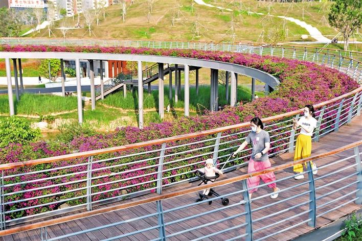 春和景明,正是“千花百卉争明媚”的好时节,龙华各大公园成了市民踏青赏花的首选地。北站中心公园空中连廊的簕杜鹃开始藏不住那惹人流连的紫,环形连廊姹紫嫣红一片,蔚为壮观。绿地、溪流、登山道……有着丰富景观元素的大浪羊台山森林公园总是吸引不少市民前来游览,有的结伴在广场上打羽毛球,有的往返于溪流之间,有的则登上山顶饱览美景。