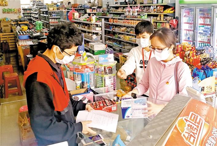 观湖街道工作人员向“三小”场所经营者免费派发防疫物资。