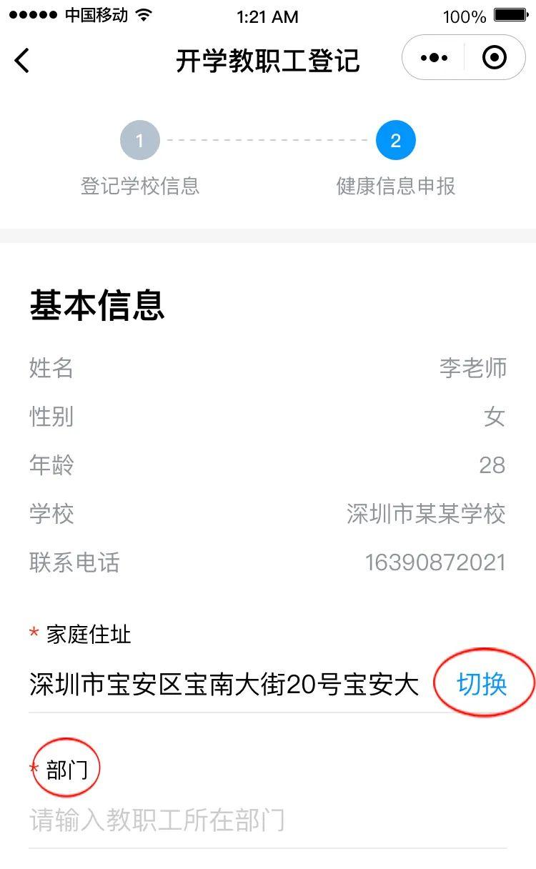 请根据实际情况完成健康信息申报,包括选择家庭住址、填写所在部门、申报健康情况。