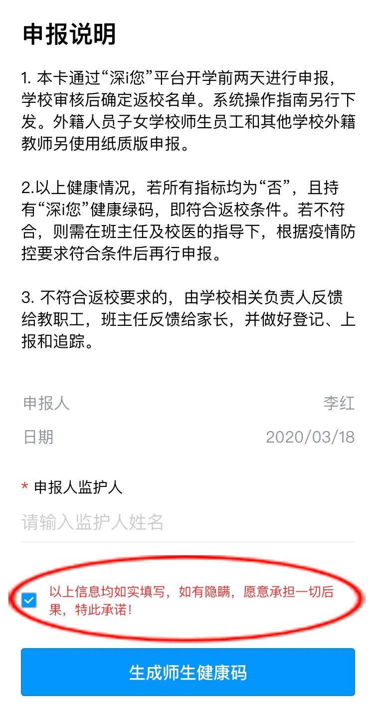 健康信息申报后,请勾选申报承诺,点击“生成师生健康码”即可完成健康申报。