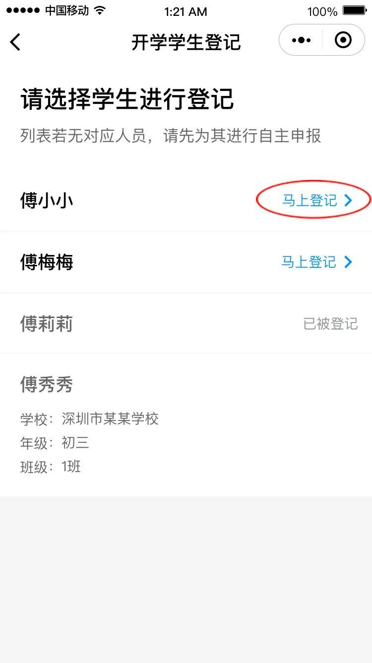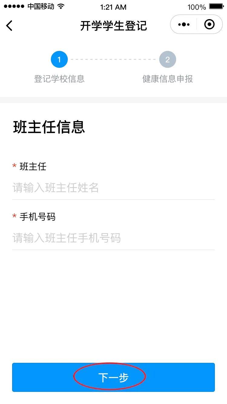 进入“开学学生登记”页面,点击“马上登记”进入登记界面,填写班主任姓名和手机号码后点击“下一步”,请选择对应的班级,进入健康申报卡界面。