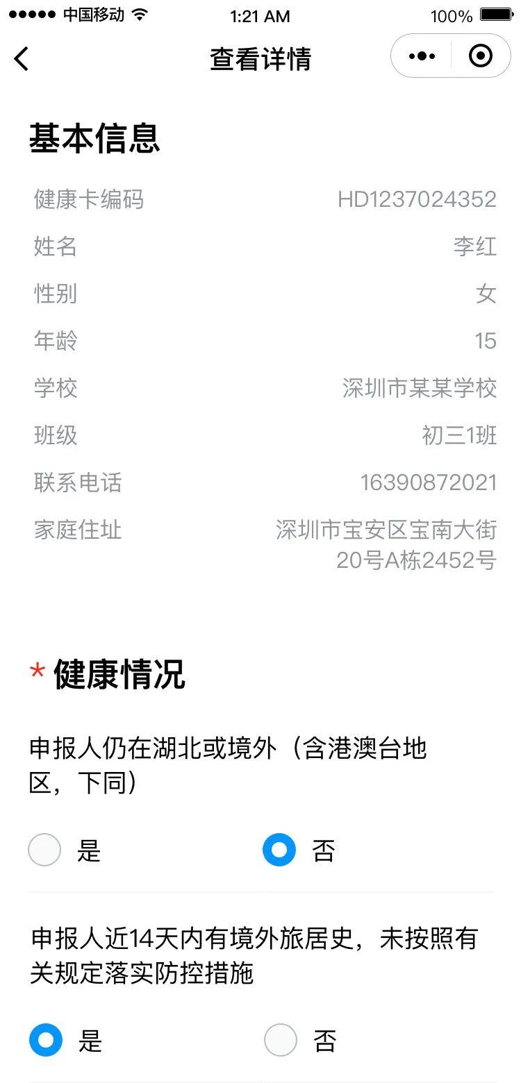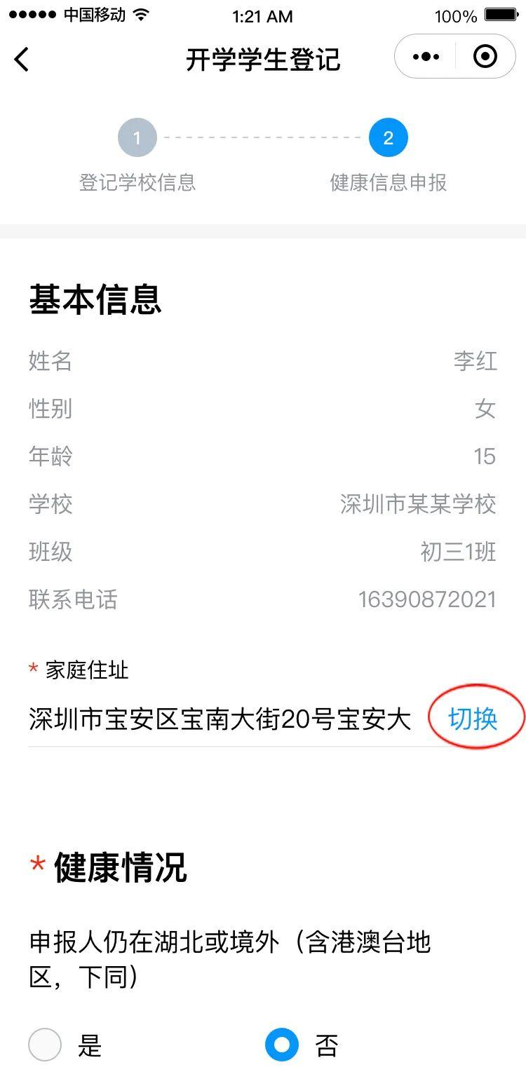 请根据实际情况完成健康信息申报,包括选择家庭住址、申报健康情况、填写监护人姓名。