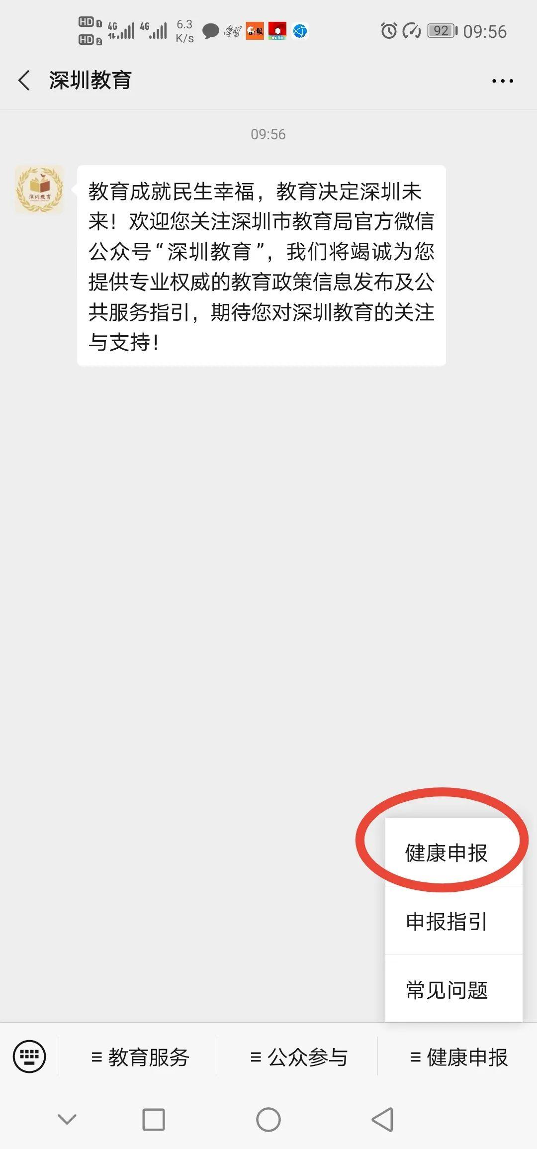 微信关注“深圳教育”微信公众号,点击底部菜单栏“健康申报”即可申报。