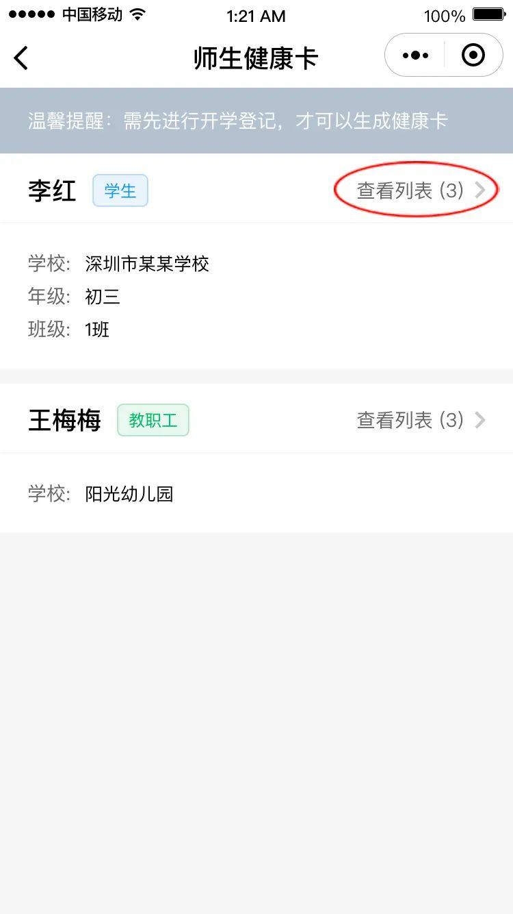在开学专区,点击“师生健康卡信息”,进入师生健康卡人员列表。