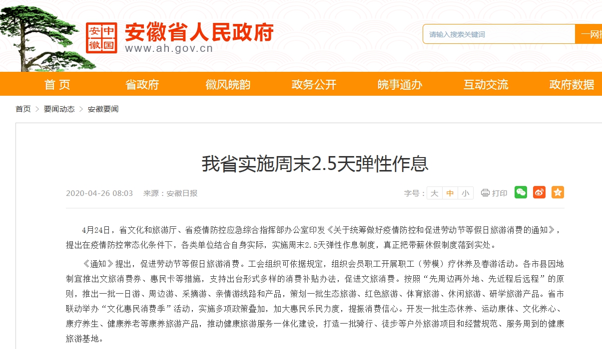 中新网客户端2020年4月26日电 近日,安徽省文化和旅游厅、省疫情防控应急综合指挥部办公室印发的《关于统筹做好疫情防控和促进劳动节等假日旅游消费的通知》提出,在疫情防控常态化条件下,各类单位结合自身实际,实施周末2.5天弹性作息制度,真正把带薪休假制度落到实处。
