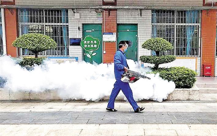 龙华中学防疫消杀人员对校园进行消杀。