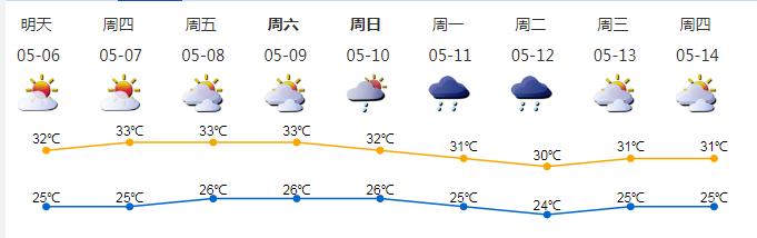 6-9日多云间晴天,天气炎热,午后局地有热雷雨;10-11日受冷空气影响,有雷阵雨。