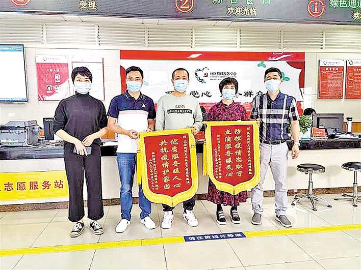 社区居民向社区工作人员送锦旗致谢。