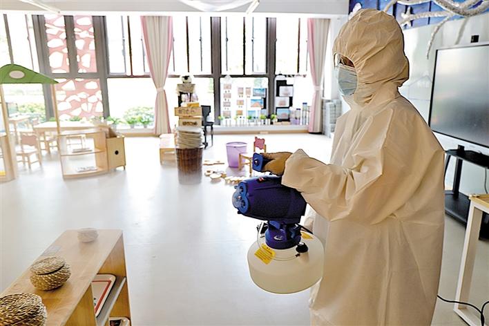 在金茂府幼儿园,消杀人员严格按照要求操作规范进行喷洒,用专业化灭蚊灭虫喷雾剂对园内的各个角落进行了全面的消杀,不放过一处卫生死角,有效防止了各种疾病,尤其是传染疾病的发生,为孩子们的健康成长提供了有力的保障。室内是孩子们游戏生活的主要场所,从“细”着手,墙面、地面、玩具柜、桌椅,每个细节都不放过。该园一直积极响应并严格按照上级指示做好相关工作部署,各岗位的教师早已加入战“役”工作中,全面做好复学开园的准备工作。