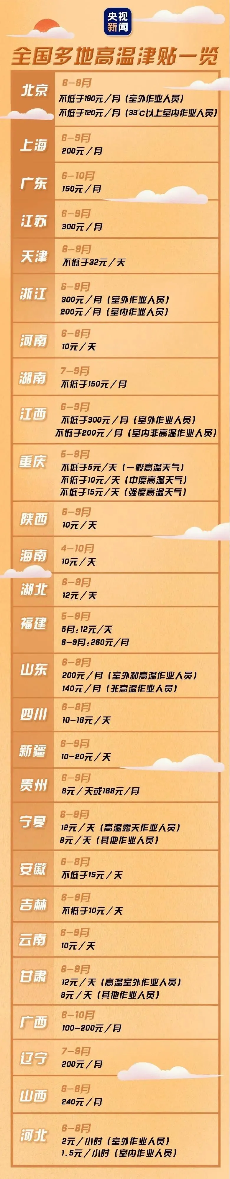 部分省份高温津贴发放标准如下: