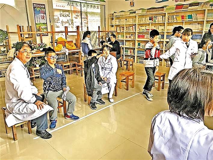 刘精锋医生(左一)走遍凤山县10所公立学校,完成1.2万名在校学生的视力筛查。