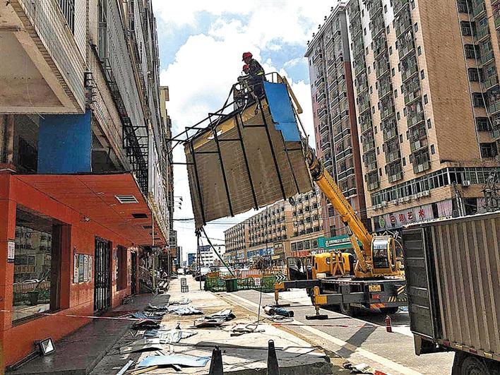 福城街道执法人员拆除违规广告牌,防止在汛期产生次生灾害。