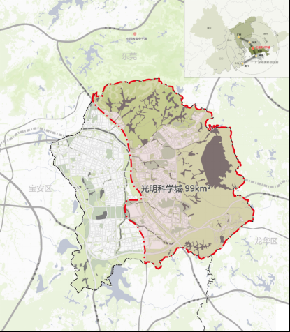 光明科学城北起深莞边界,东部和南部以光明区辖区为界,西部以龙大高速和东长路为界,规划总面积99 平方公里。
