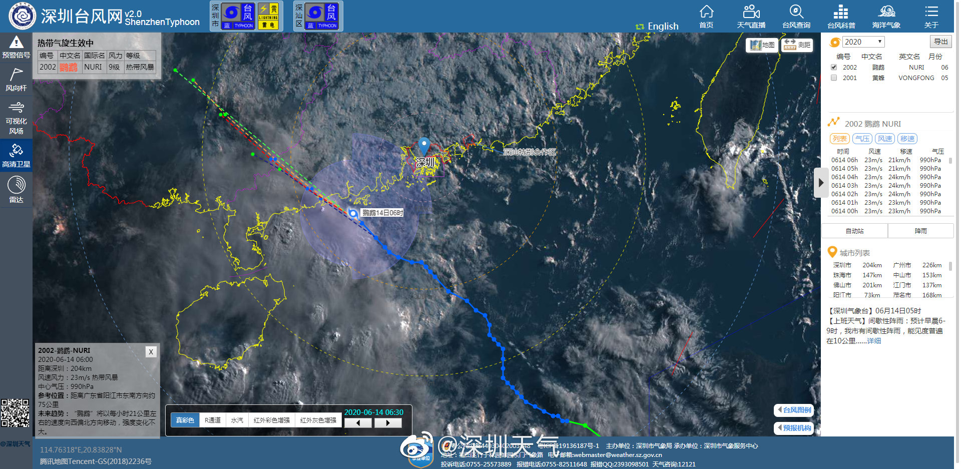 记者从深圳市气象局获悉,6月14日06时台风“鹦鹉”(热带风暴级)位于深圳市西南方约205公里南海海面上,中心附近最大风力9级。