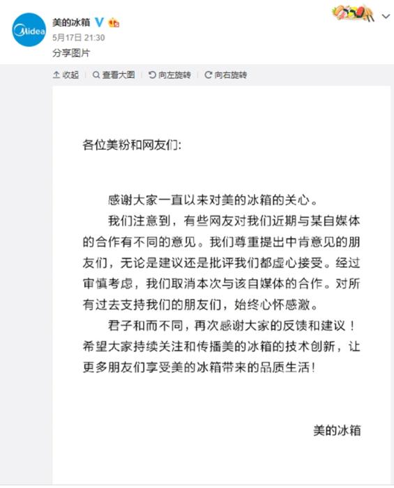 另一个家电巨头美的直播带货开局不顺,5月17日,美的冰箱放出直播带货预告,可没几个小时就被网友扒出该带货自媒体的黑历史,美的冰箱直播带货首秀夭折。