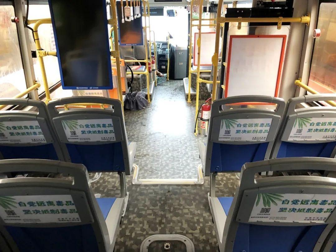 在“平安专线”公交车内座位的广告区