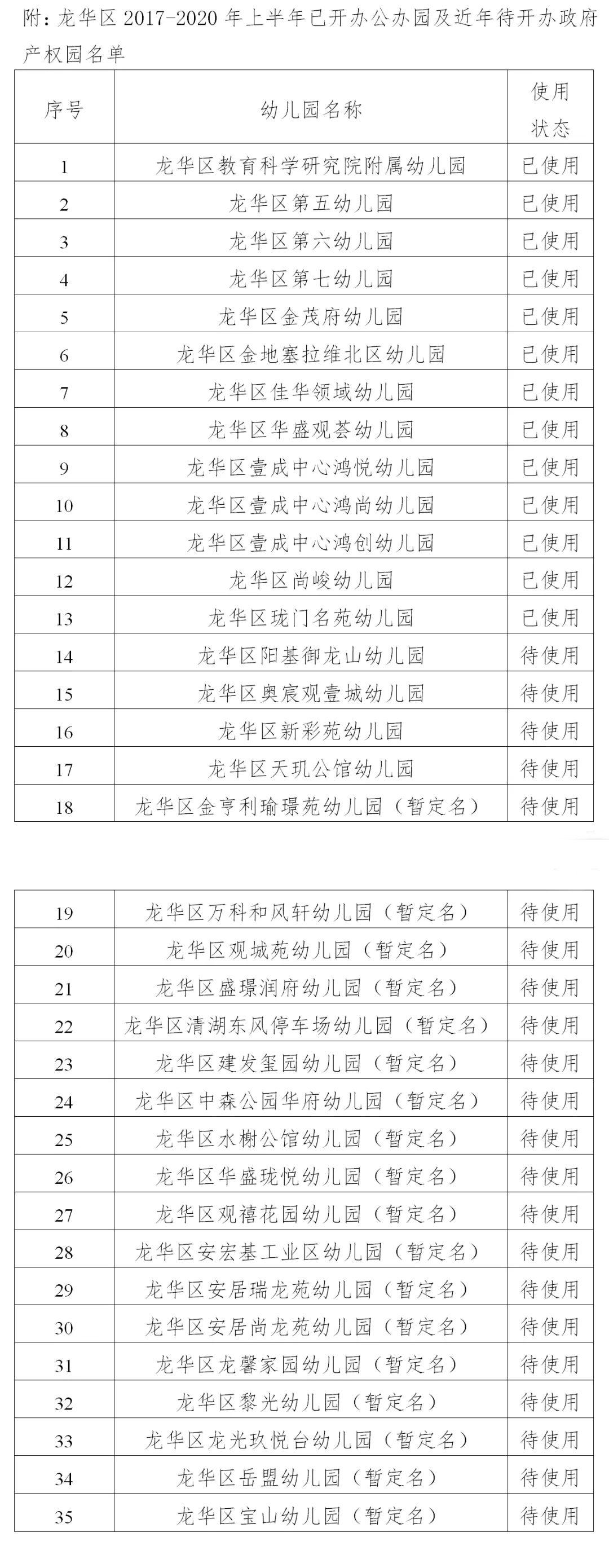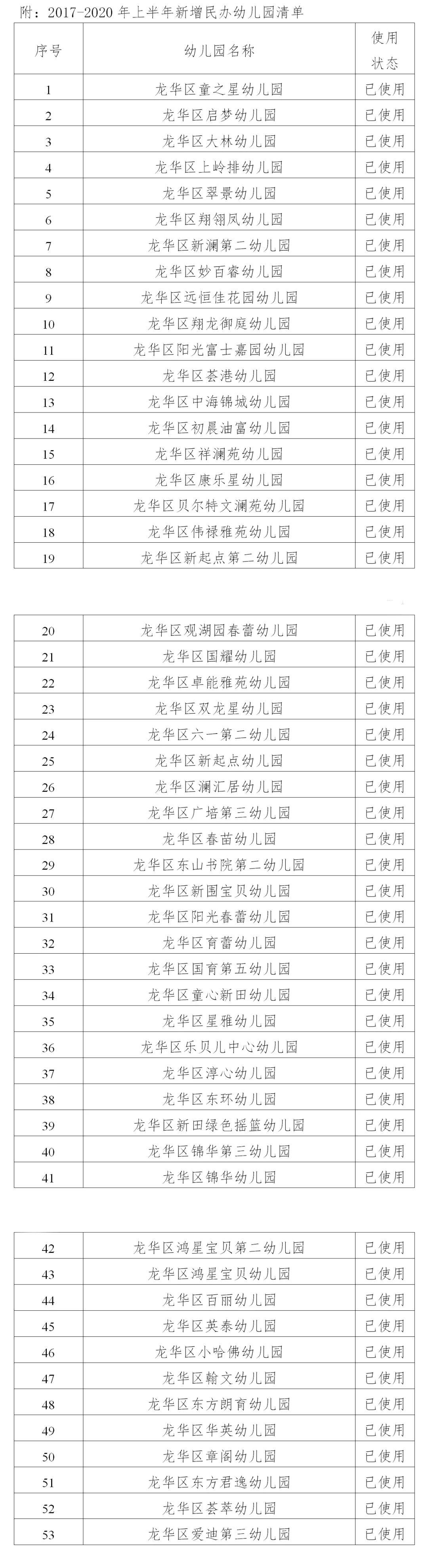 2020年上半年,龙华区继续加大公办幼儿园建设力度,新增规划类及租赁转办幼儿园7所,增加学位2880个。