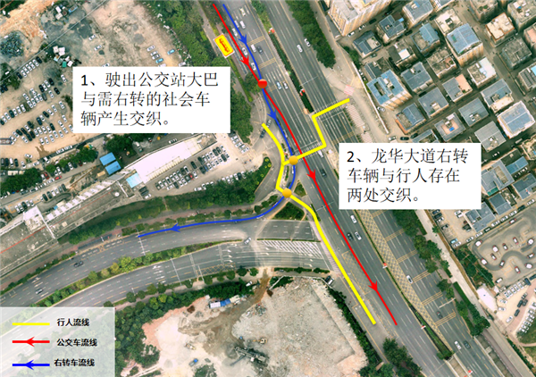 为使龙华大道-留仙大道交叉口在路网完善前可满足现有跨区域交通需求,交通、交警部门联合进行调研,研究通过“短、平、快”措施来提高道路资源利用效率。经分析,治理前突出问题包括:大量右转车辆与过街行人存在多次交织,影响右转匝道通行效率,右转排队过长;右转车辆与靠站公交车辆存在冲突,既影响公交进站上下客,也影响右转排队空间;不少右转车辆不遵守排队规则,违规变道、加塞不仅加剧了靠站公交车辆与右转社会车辆的交织,进一步降低右转效率,而且占用了两条直行车道空间对直行交通造成妨碍。