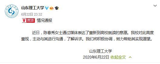 近日,陈春秀通过媒体表达了重新到高校就读的意愿。山东理工大学对此高度重视,主动与其进行沟通,了解诉求。将积极协调,努力帮助其实现愿望。