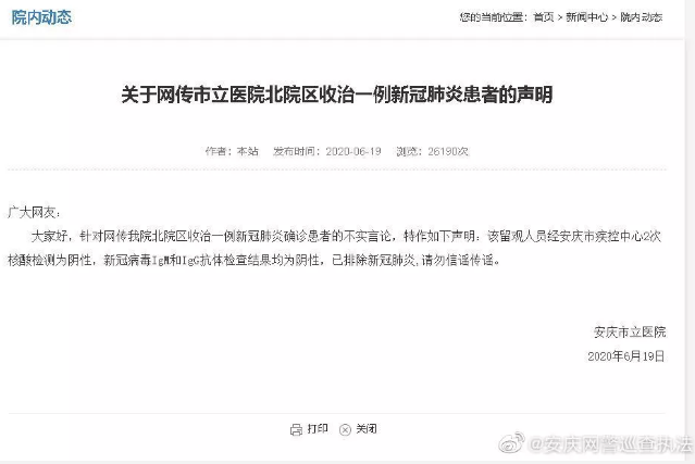 6月19日,安庆市立医院发布声明表示,该留观人员经安庆疾控中心核酸检测和新冠病毒抗体检查,结果均为阴性,已排除新冠肺炎。